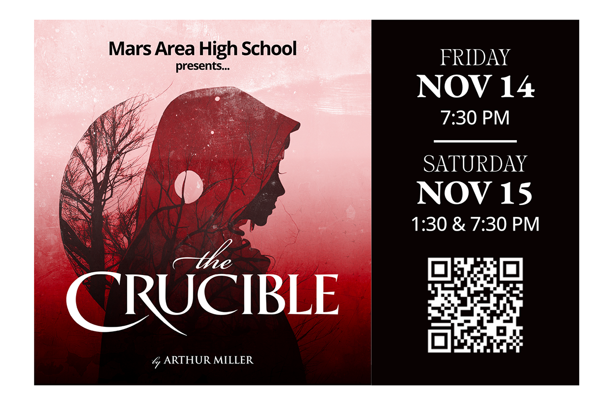 Mars Area High School will present Arthur Miller’s The Crucible at 7:30 p.m. on Friday, Nov. 14, and at 1:30 and 7:30 p.m. on Saturday, Nov. 15, in the auditorium.
